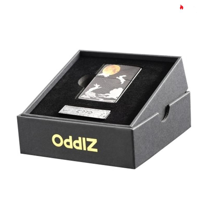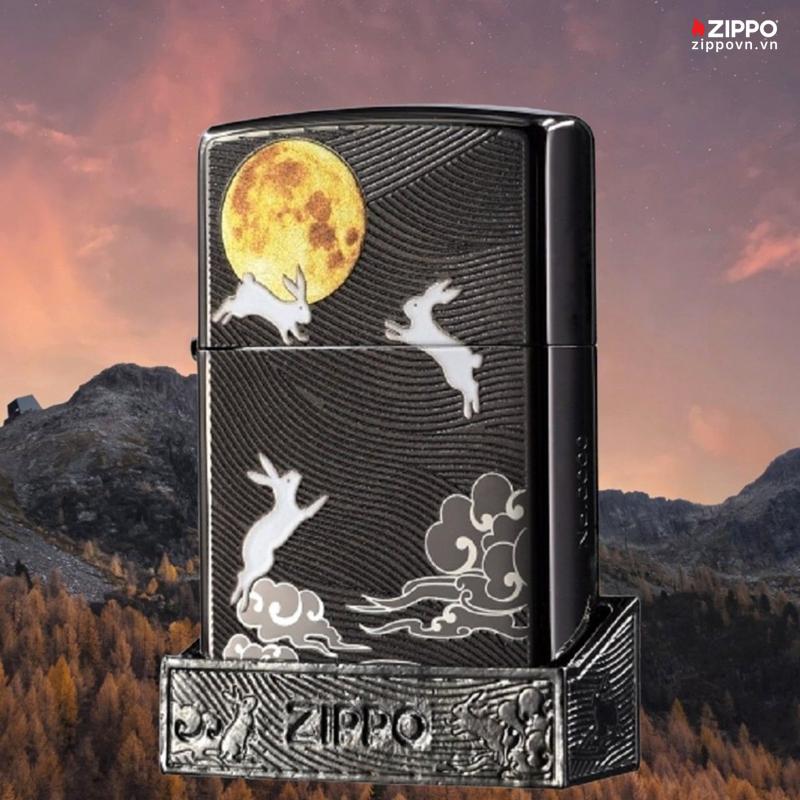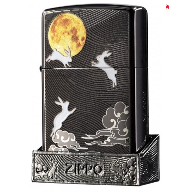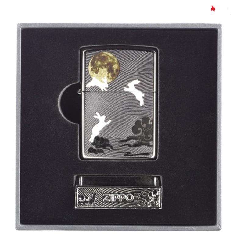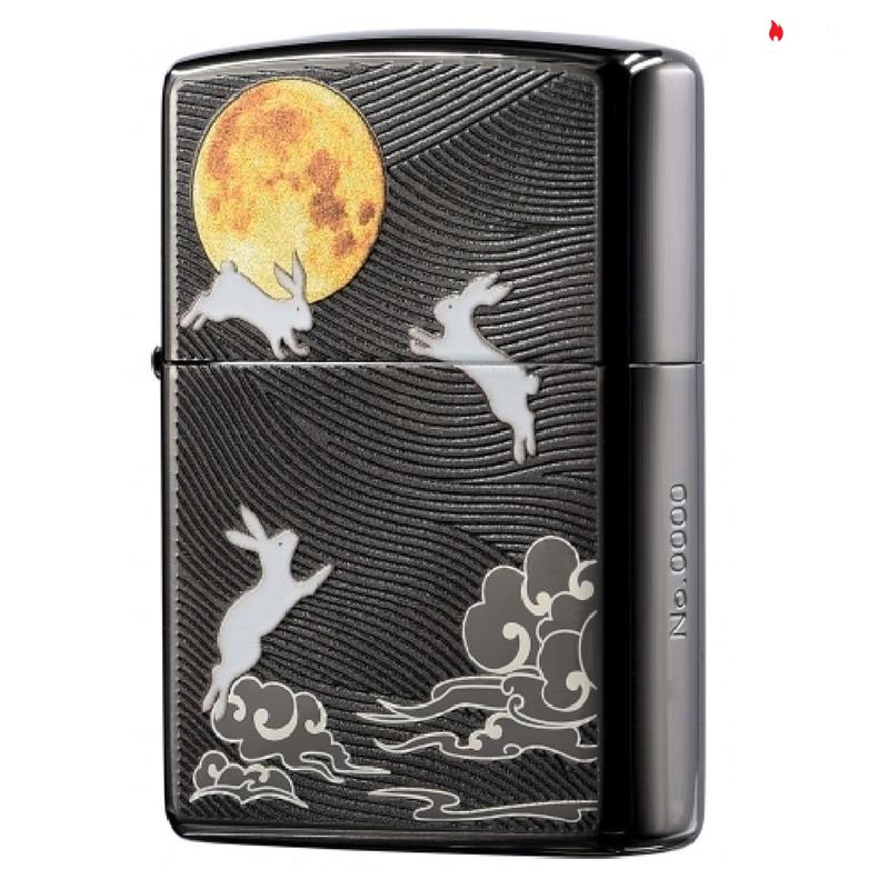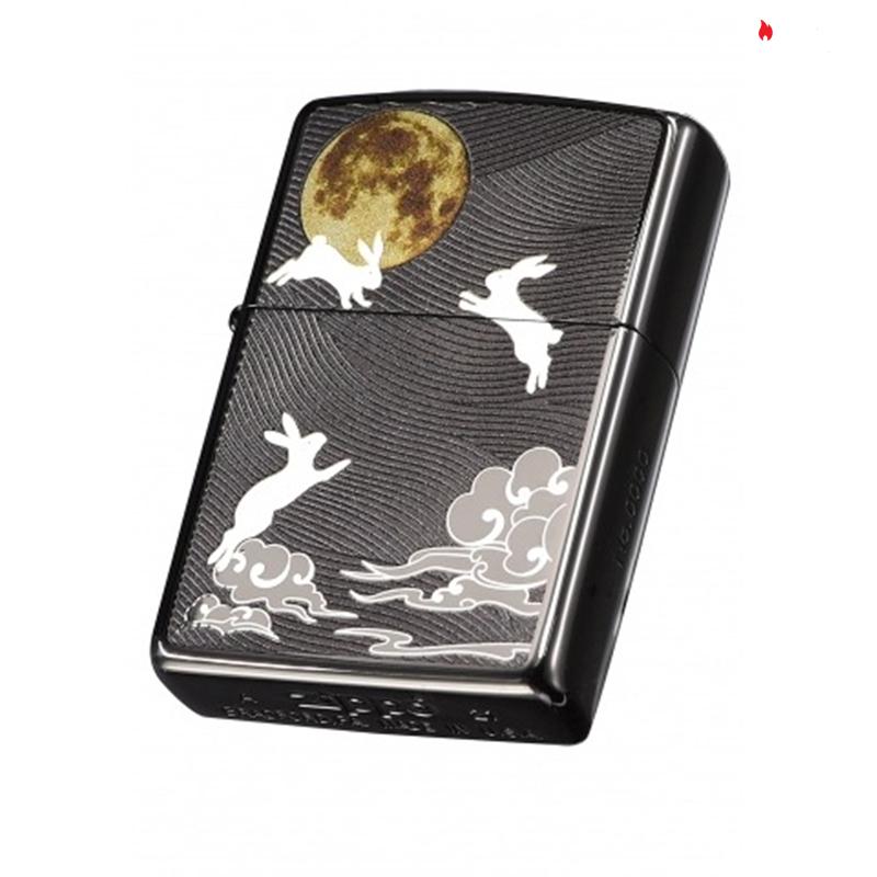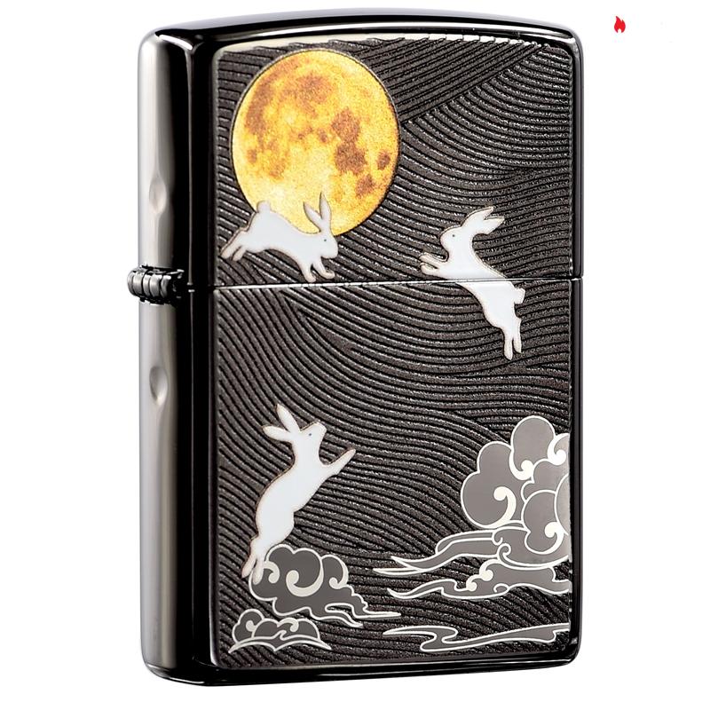 – Với thiết kế mô hình mặt trăng tròn, ba chú thỏ và đám mây thực hiện trên chiếc bật lửa mạ màu đen bóng High Polish Black đáy lồi. Phương pháp khắc được sử dụng để phác thảo toàn bộ hình ảnh trên bề mặt chiếc bật lửa.